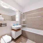 A kényelem érdekében az ingatlanban külön WC és zuhanyzó biztosított. Hajszárító és fürdőlepedők ugyancsak elérhető.